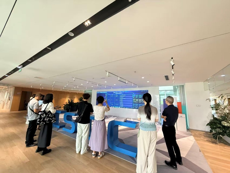 活动伊始,教师团队在中建西南咨询同事的引导下,实地参观了这座集低碳设计、智慧运营于一体的标志性建筑。通过讲解,大家深入感受到这栋“会呼吸的”近零碳建筑,以及其在节能材料、自然通风、光伏系统等方面的创新实践。在“碳中和技术展示中心”和“中建咨询ESG智慧大脑”平台前,老师们驻足交流,切身感受到数字化技术在绿色建筑全生命周期管理中的深度赋能。随后,座谈会在5302会议室正式开启。此次交流聚焦工程造价数字化转型前沿议题,旨在推动高校人才培养与行业技术变革同频共振,探索产学研深度融合的新路径。