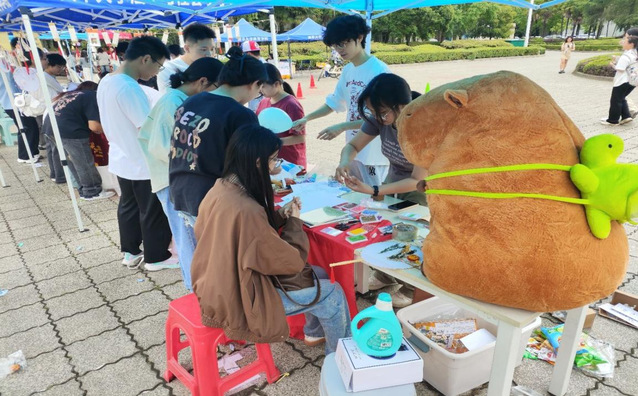 “爱的抱抱”活动以萌系玩偶卡皮巴拉互动打造治愈场景,现场设置卡皮巴拉毛绒玩偶及“烦恼退散”背景板,参与者可自由拥抱、合影并领取定制治愈贴纸,同时设有“慢时光充电站”播放白噪音供沉浸式放松,还可通过“烦恼置换箱”投入烦恼纸条、抽取卡皮巴拉主题治愈语。活动通过萌宠元素与轻松氛围,帮助学生缓解压力、传递温暖。