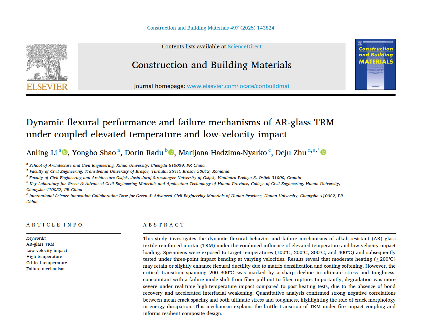 近日,西华大学建筑与土木工程学院组合结构团队在国际著名期刊Construction and Building Materials (中科院1区TOP,IF=7.4)上发表了题为《Dynamic flexural performance and failure mechanisms of AR-glass TRM under coupled elevated temperature and low-velocity impact》的最新研究成果。该论文以西华大学为第一完成单位,李安令博士为第一作者,邵永波教授参与研究,论文由湖南大学朱德举教授担任通讯作者,并联合罗马尼亚布拉索夫特兰西瓦尼亚大学的Dorin Radu副教授、克罗地亚奥西耶克大学的Marijana Hadzima-Nyarko教授共同完成。