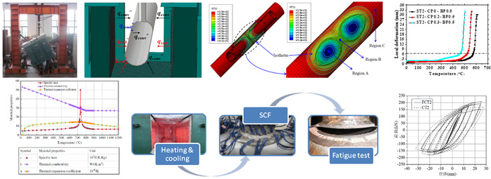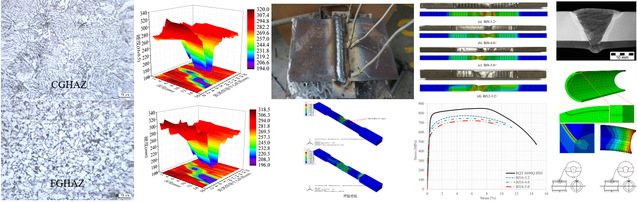 焊接过程中热影响区内各子区域会经历不同的焊接热循环,形成多种微观结构,从而影响焊接高强钢构件力学性能的各个方面,包括静力强度,疲劳性能和冲击韧性等。团队对热影响区的微观结构和材料性能进行了初步研究,揭示了不同峰值温度和冷却速率下形成的微观结构所对应的材料属性,为进一步深入研究焊接过程对高强钢构件焊后性能的影响奠定了基础。采用实验研究和有限元分析相结合的方式,对使用不同焊接热量制备的S690高强钢对接节点的静力强度进行了系统的分析。建立了焊接热量与热影响区宽度和节点强度之间的关系。通过有限元分析,模拟了非均质热影响区材料属性的形成过程。基于对比实验结果,确定有限元分析准确性的前提下,进行了参数分析,为高强钢焊接过程提出指导建议,以降低焊接过程对高强钢节点静力强度的影响。建立了焊接高压容器和焊接输气管道在焊接部位包含各种裂纹缺陷的有限元分析模型,包括:表面裂纹、穿透裂纹、内嵌裂纹、环状裂纹等,通过有限元仿真模拟分析计算得到焊接部位裂纹的应力强度因子,提出了含裂纹缺陷容器和管道完整性评估方法。