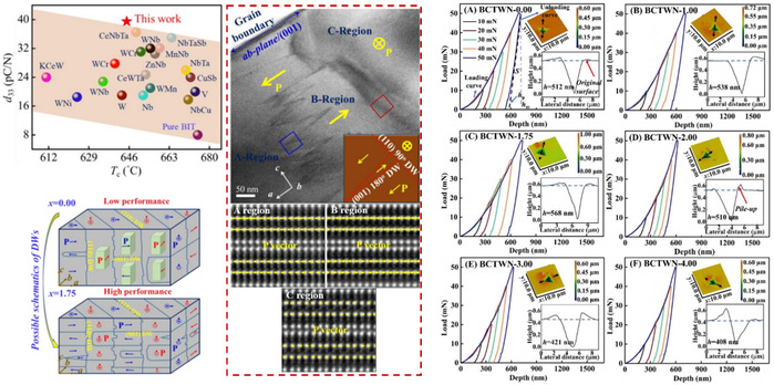 解析了高密度的(001)型180°畴结构,该畴结构主要贡献了多离子共掺杂 BIT 陶瓷系统的超高压电性能(d33~38.5 pC/N,d33*~46.7 pm/V 在低电场下)和优异的抗疲劳性(稳定高达 107次循环)。这一突破将为 BIT 铁电体超高性能的未来发展开辟新的前景。