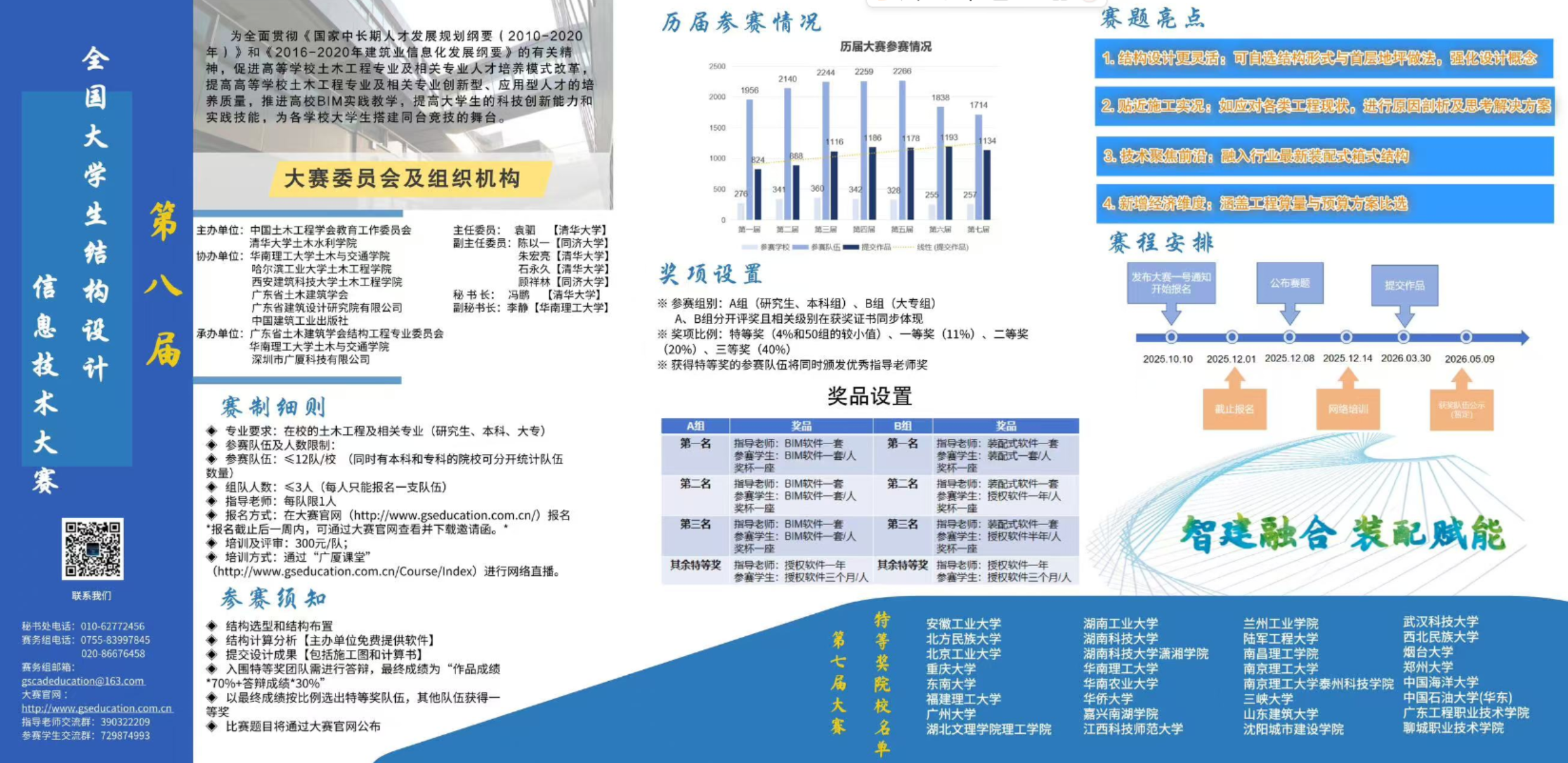 “第八届全国大学生结构设计信息技术大赛”由中国土木工程学会教育工作委员会、清华大学土木水利学院主办,华南理工大学土木与交通学院、哈尔滨工业大学土木工程学院、西安建筑科技大学土木工程学院、广东省土木建筑学会等单位协办,广东省土木建筑学会结构工程专业委员会、华南理工大学土木与交通学院承办。该比赛的主要目的为促进高等学校土木工程专业级相关专业人才培养模式改革,提高高等学校土木工程专业级相关专业创新型、应用型人才的培养质量,推进高校BIM实践教学,提高学生的科技创新能力和实践技能,为各学校大学生搭建同台竞技的舞台。