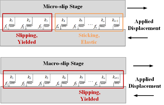 针对连接接触界面切向微观滑移阶段的刚度非线性效应与宏观滑移阶段的残余刚度特性,基于Iwan模型框架建立了能够准确描述接触界面非线性滑移行为的六参数本构模型。该模型将界面细观粘滞-滑移效应与宏观载荷-位移关系有效衔接,准确反映了螺栓连接结构的切向刚度和切向承载力随界面相对化滑移的演化规律。