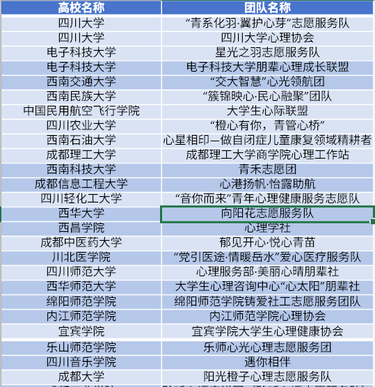 西华大学向阳花志愿服务队立足向阳花心理工作室组成,长期致力于青少年心理健康服务工作,通过开展心理科普宣传、心理疏导帮扶、心理团辅活动等多种形式的志愿服务,为青少年心理健康保驾护航。此次成功入选,是对该团队志愿服务工作的高度认可,也为团队后续开展心理志愿服务活动提供了有力的支持。接下来,向阳花志愿服务队将充分利用此次机会,不断提升志愿服务的专业性与实效性,继续在青少年心理健康领域深耕细作,为推动四川省高校心理志愿服务事业发展、守护青少年心理健康贡献西华力量。