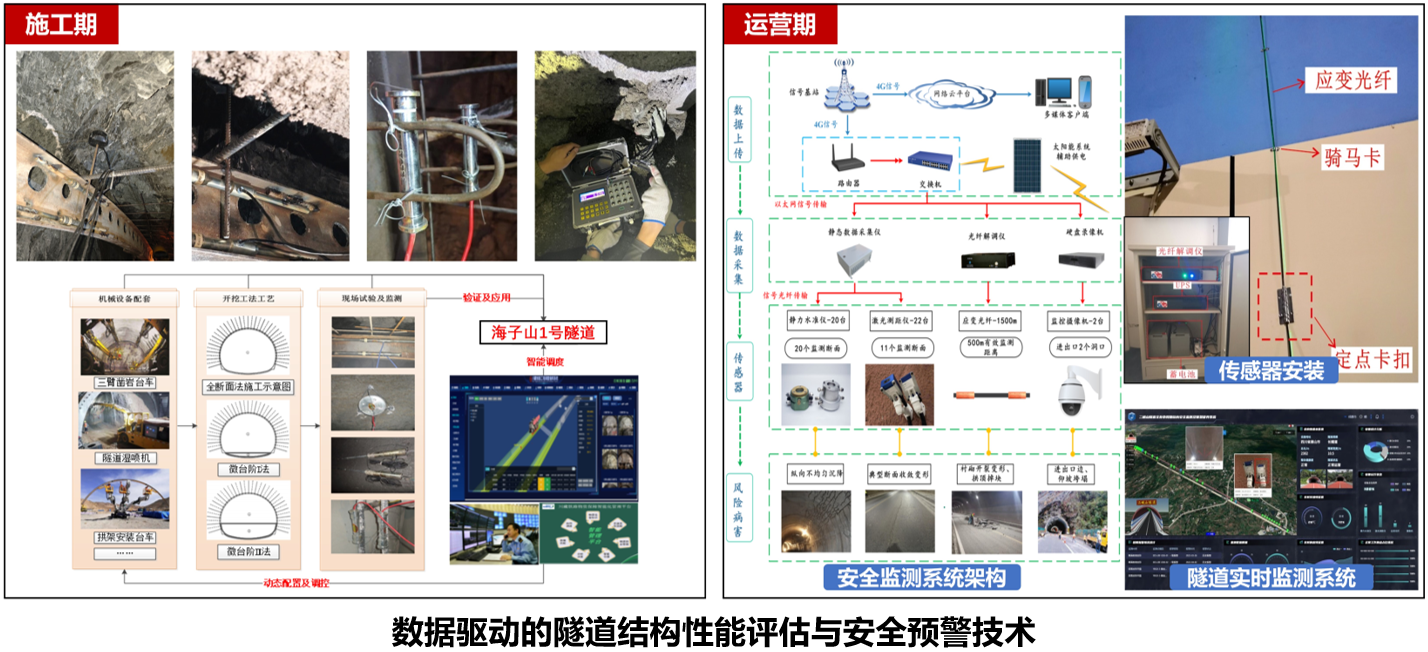 为解决隧道在施工与运营期间安全监测难度大、时效性差的问题,隧道数智建设及安全运维团队基于人工智能与大数据分析技术,引入智能监测与检测方法,构建了隧道工程数智化安全监测系统架构,研发了隧道实时监测系统,为大变形隧道结构提供了智能化的安全健康整体解决方案。基于大量既有隧道灾变与病害数据,通过深入的大数据分析与挖掘,建立了更贴合实际工程条件的性能评价方法。在此基础上,依托隧道结构安全预警与应急机制,实现了预警信息的实时发布,并开展了隧道结构应急安全评估与技术咨询工作;最终构建的隧道安全监测系统,为实现隧道服役性能的精准、合理评价提供了可靠支撑。