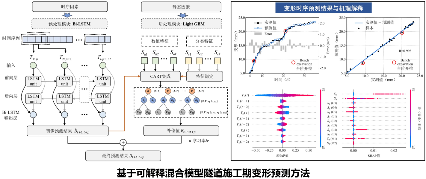 隧道数智建设及安全运维团队提出了一种预测山岭隧道施工期变形的混合模型,综合考虑时序和静态因素。模型采用集成提升技术,结合了擅长处理时序数据的Bi-LSTM网络和处理表格数据性能优异的Light GBM模型,分别用于处理时序和静态因素。基于真实施工与监测数据,与既有机器学习模型对比,该模型在局部和整体预测误差方面均表现出色。通过在Light GBM中引入各监测断面的静态因素,模型有效解决了时序预测中的时间延迟问题。采用SHAP方法对混合模型进行解释,结果表明模型的预测规则与隧道工程及物理力学基本原理高度一致,验证了其可靠性和实用性。该模型有效融合了Bi-LSTM与LightGBM模块,为时序预测延迟问题提供了可靠解决方案;测试集均方根误差为0.455mm、平均绝对百分比误差为2.604%,相关系数为0.995;基于SHAP方法解释了混合模型决策机制。
