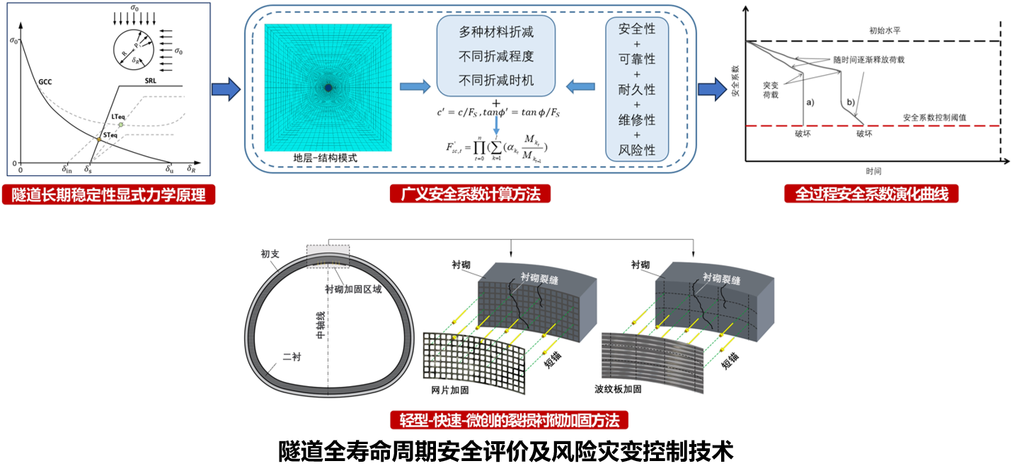 针对我国隧道服役过程中日益显现的病害与破坏问题,隧道数智建设及安全运维团队通过数值模拟结合理论创新研究,揭示了围岩和支护结构间的能量传递、转化和耗散的动态演变机制,建立了隧道稳定性极限状态能量判据,研发了隧道全寿命期广义安全系数求解方法。在围岩压力作用下,衬砌主要表现为大小偏心受压两种受力模式,其中隧道衬砌裂损是结构病害中最为普遍的一种情况。提出了一种轻型-快速-微创的网片-短锚(网-锚)加固和波纹板-短锚(板-锚)加固裂损衬砌的方法,揭示了加固组合结构的力学特性,获得了加固的关键设计参数。