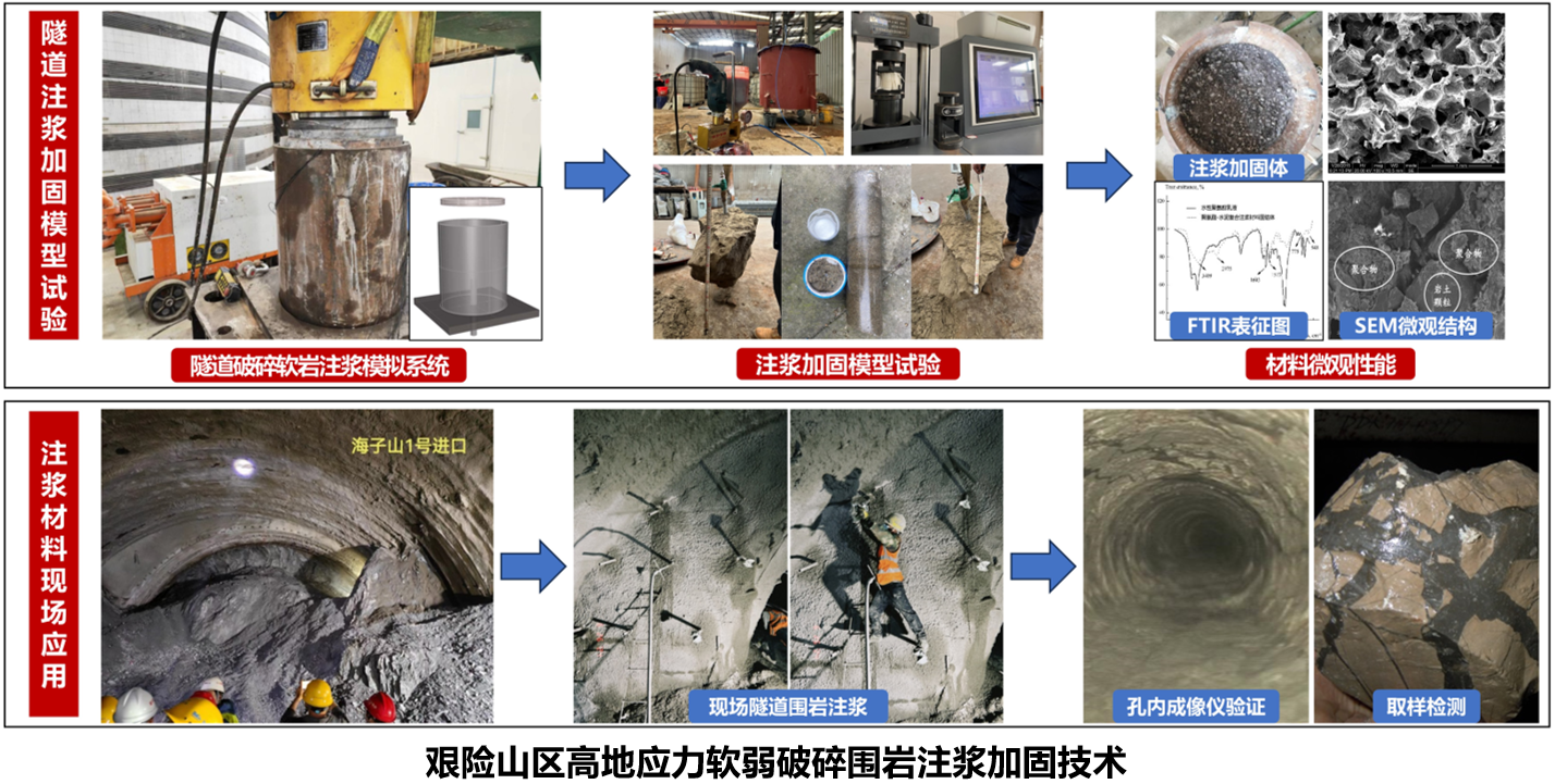 围岩既是荷载的来源,也是约束结构变形的重要组成部分。为有效控制高地应力软岩隧道的变形,有必要对围岩进行注浆加固。依托海子山1号隧道,隧道数智建设及安全运维团队开发了一种针对高地应力软弱破碎围岩隧道工程的注浆加固模拟系统,并研发了一种适用于软弱破碎地层可注性强、效果可控的注浆加固材料;通过一系列现场试验与室内试验,系统研究了注浆体的宏观力学性能与微观结构特征,揭示了其加固机制。该技术已在久马高速海子山1号隧道中成功应用,取得了良好的工程效果。