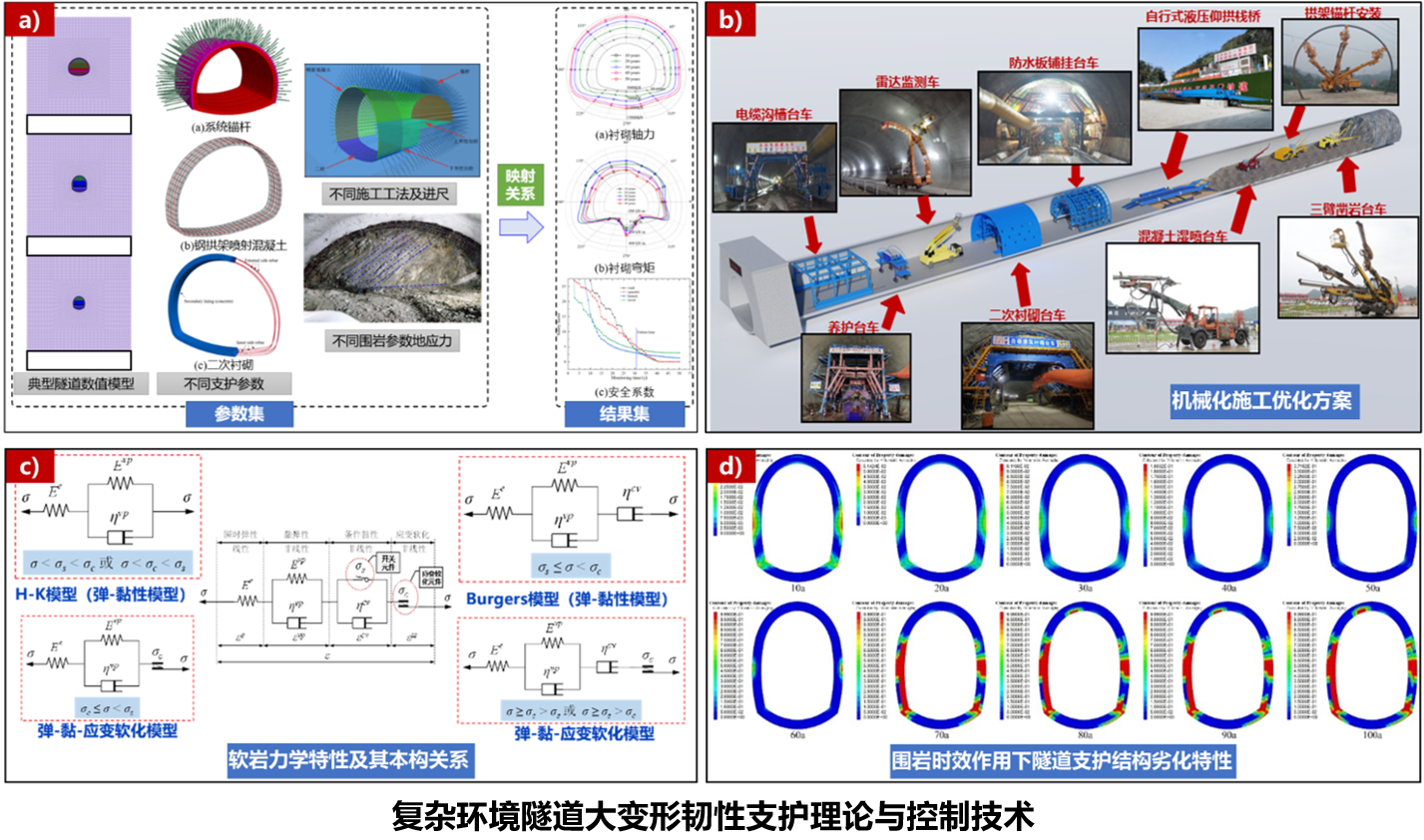 针对西部复杂艰险山区深埋软岩隧道的大变形控制难题,隧道数智建设及安全运维团队研究了不同地质特征、施工环境和施工关键参数下的隧道施工力学行为,揭示了大变形隧道的失稳模式及支护结构破坏特征;基于蠕变与应变软化耦合机制,进行软岩本构模型的二次开发,实现对软岩时效变形与损伤演化过程的定量分析;研究了不同开挖工法、预留变形量、支护时机等关键参数的变形控制效果,建立了基于监控量测反演与开挖参数动态设计互馈体系;研究了悬臂掘进机、多臂凿岩台车、多功能支护台车等机械化装备的适用性、工作效率与环保效益,建立了大变形隧道的机械化施工优化方案;研究了钢纤维混凝土支护结构的力学性能,评估其在增强延性与能量耗散方面的作用机制;研究了让压支护条件下衬砌结构的受力与变形特征,揭示了塑性与粘性耦合条件下隧道体系的能量转化与耗散规律。通过系统研究,构建了适用于软岩大变形隧道的韧性支护理论与控制技术体系,为复杂地质条件下隧道工程的安全、稳定及长期耐久提供理论依据与工程指导。