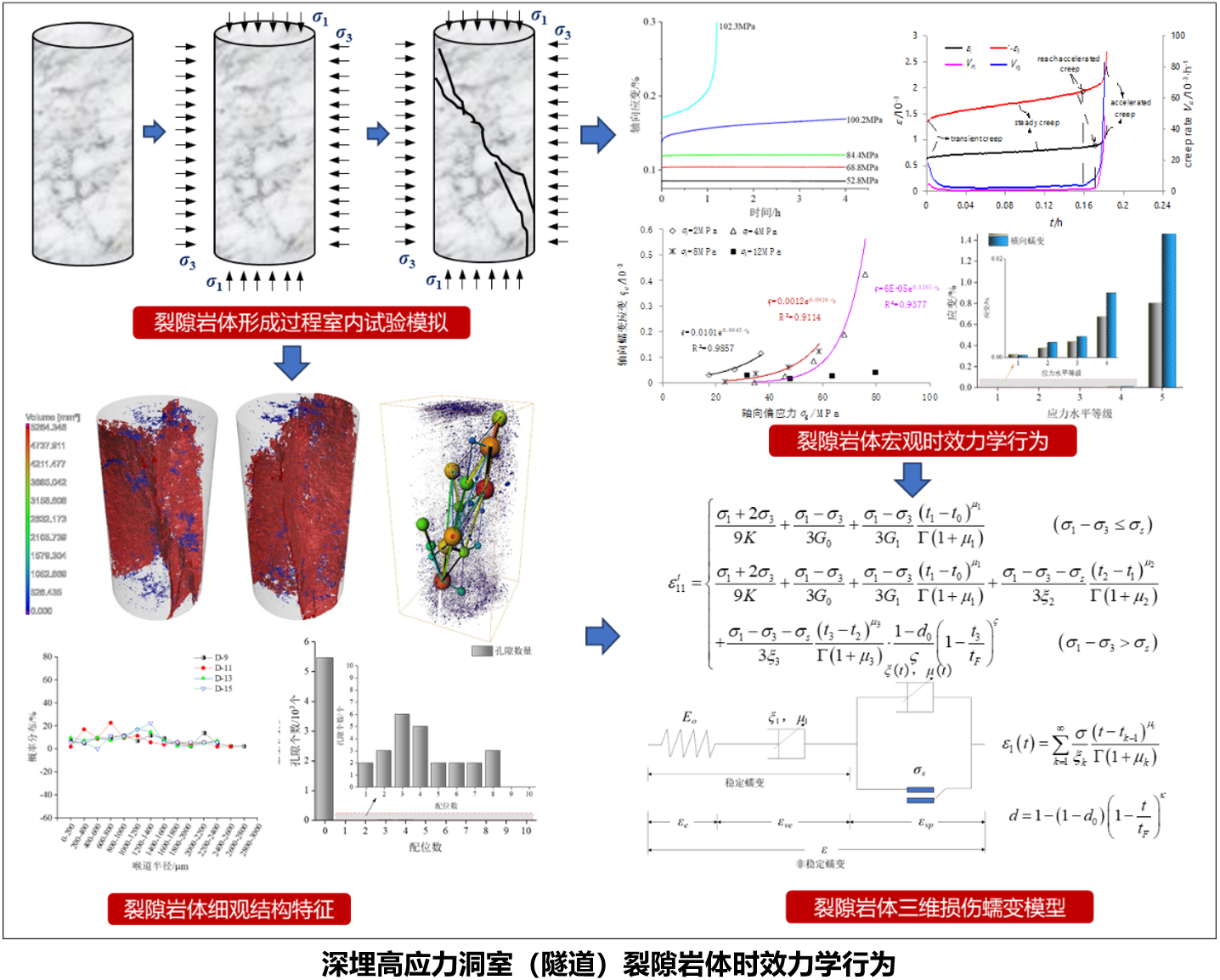 深埋隧道围岩赋存环境复杂,高应力和强扰动特性突出,岩体表现出强时间效应,围岩变形收敛慢、变形大,给施工安全和工程的长期稳定带来了不利影响。隧道数智建设及安全运维团队综合试验和理论研究,探索了能够反映围岩应力调整过程的室内裂隙岩体试件制备方法,从宏--细观角度揭示了裂隙岩体时效行为及损伤时效演化规律,建立了能够描述裂隙岩体轴向和横向蠕变全过程中的非线性三维蠕变损伤模型,为深埋隧道围岩长期变形预测及稳定性评价提供理论依据和技术支撑。