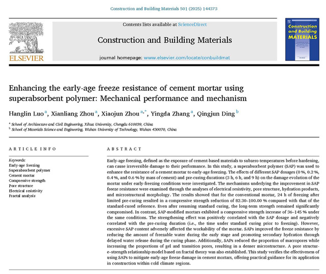 近日,西华大学建筑与土木工程学院绿色高性能材料与结构团队在国际著名期刊《Construction and Building Materials》(JCR一区、中科院一区TOP,IF:8.0)上发表了题为“Enhancing the early-age freeze resistance of cement mortar using superabsorbent polymer Mechanical performance and mechanism”的最新研究成果。西华大学为论文第一单位,建筑与土木工程学院2022级研究生罗航林为论文的第一作者,周孝军副教授为通讯作者,团队周贤良博士与张英达副教授参与相关研究。该项研究还得到了武汉理工大学丁庆军教授的指导。