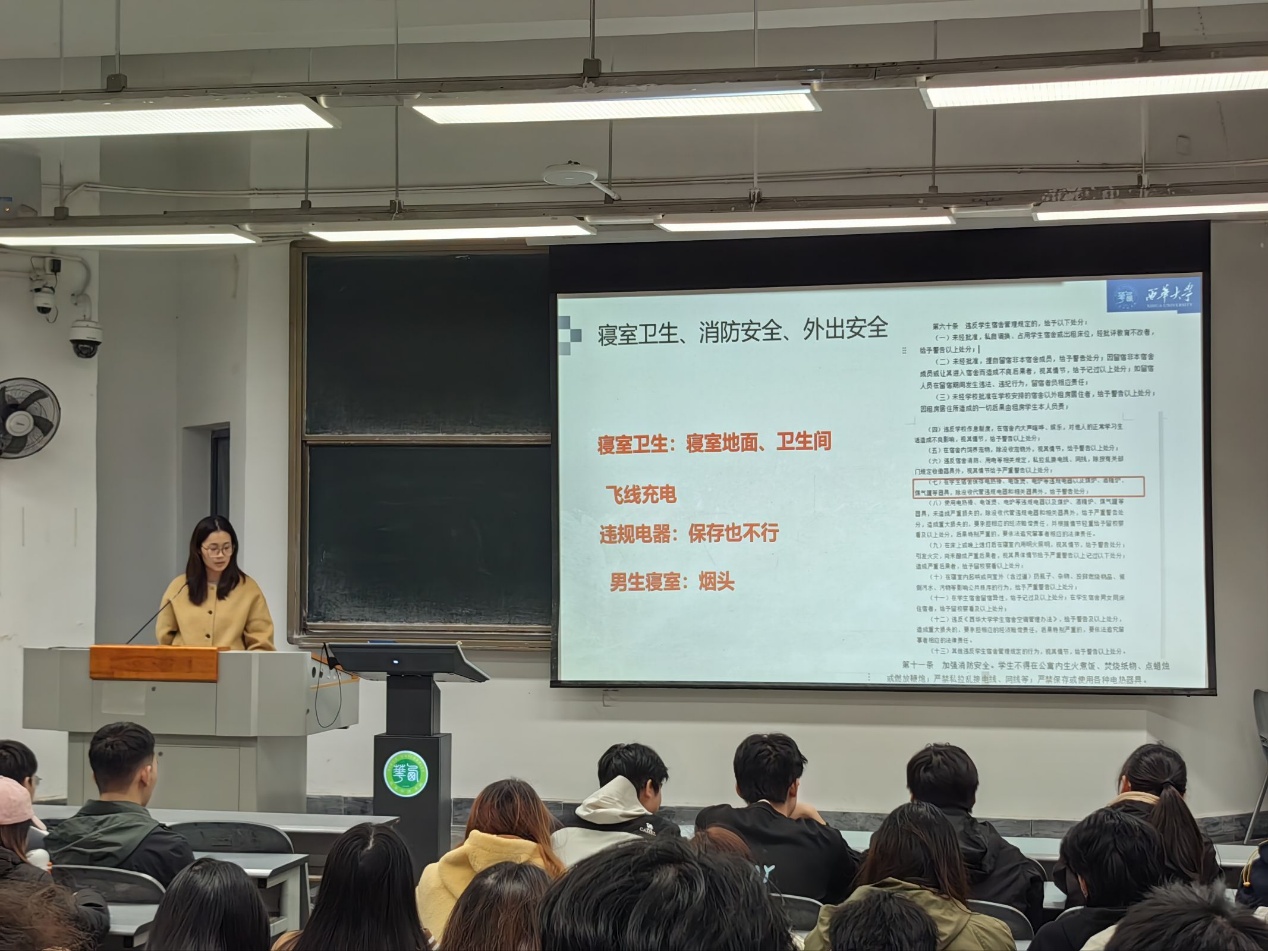 班会伊始,辅导员杨翠老师首先通报了近期学风建设情况,提醒学业进度滞后的同学及时调整状态、合理规划学习。随后,班会重点围绕消防安全教育展开。杨老师通报了各宿舍本学年的卫生评分情况及违规记录,并对相关处分情况作了说明。她结合真实案例,深入剖析了在宿舍内使用违规电器、飞线充电、乱扔烟头等行为可能引发的严重消防隐患,再次明确学校对此类行为实行“零容忍”政策,强调学生需树立底线思维。