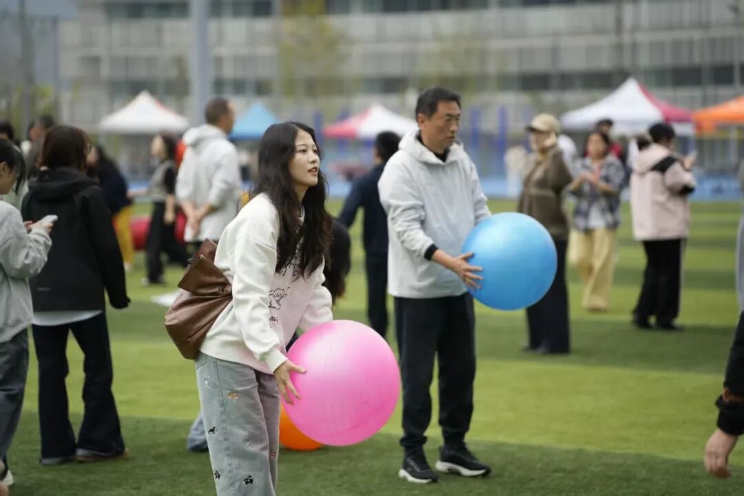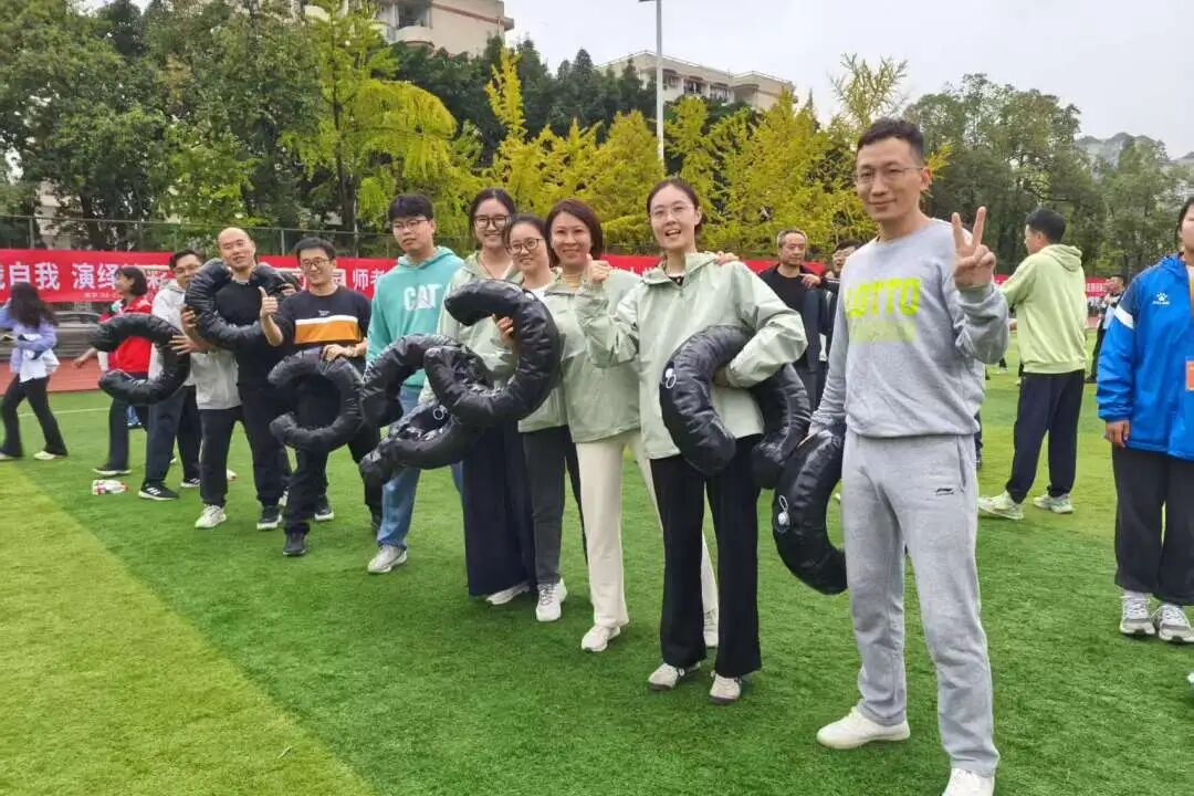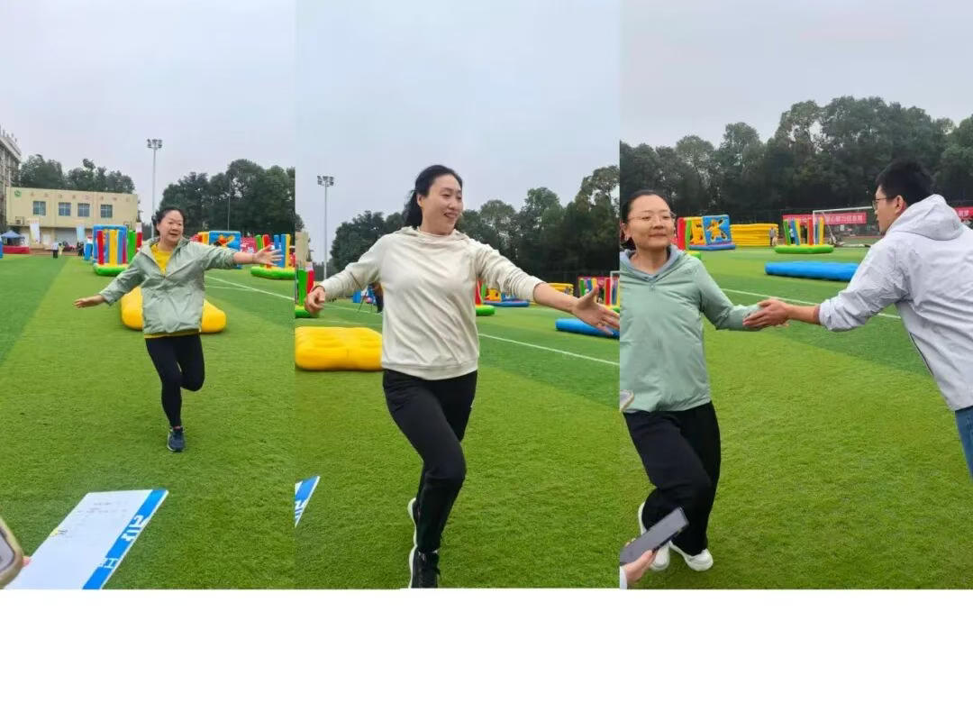 “珠联璧合”项目考验团队的配合与韧性。奔跑途中,有两位老师不慎摔倒,不等队友上前,他们已迅速爬起,拍掉尘土继续冲向终点,脸上带着“没事,不影响”的笑容。场边瞬间响起掌声,这掌声无关成绩,只为那份摔倒后立刻站起的坚韧,以及“不放弃、不掉队”的团队精神。