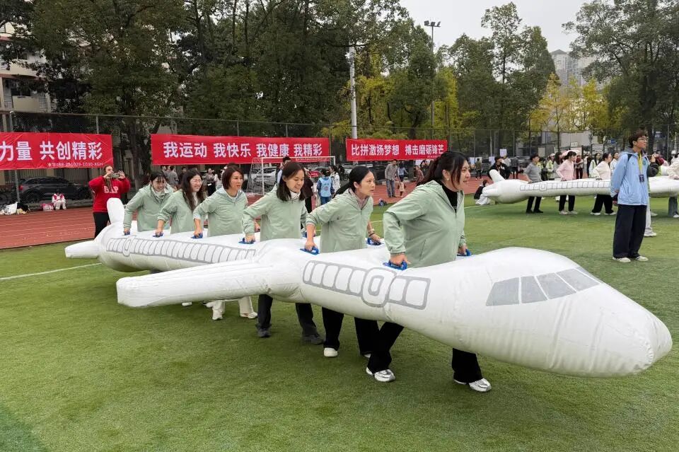 “‘翼’起向前”项目中,老师们需集体举起充气飞机道具向前奔跑。学院采用女队先出发、男队随后接力的方式。女老师们双手稳稳托举道具,步伐整齐得如同踩着同一节拍,“一二、一二”的口号声清晰有力。完成接力后,男老师们迅速跟上,借着步伐大的优势加快节奏。那份为了同一目标共同发力的劲头,让人感受到团队的向心力。