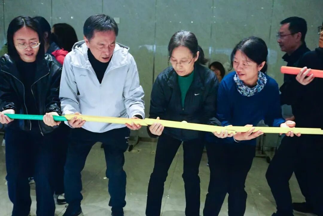 “鼓动人心”项目是团队协作的终极考验。教职工们共同操控鼓面,让小球在鼓面上持续跳动。每一次成功的跳动都离不开团队成员的高度配合,大家在调整节奏、默契协作的过程中,深刻领悟到了“人心齐,泰山移”的团队力量。