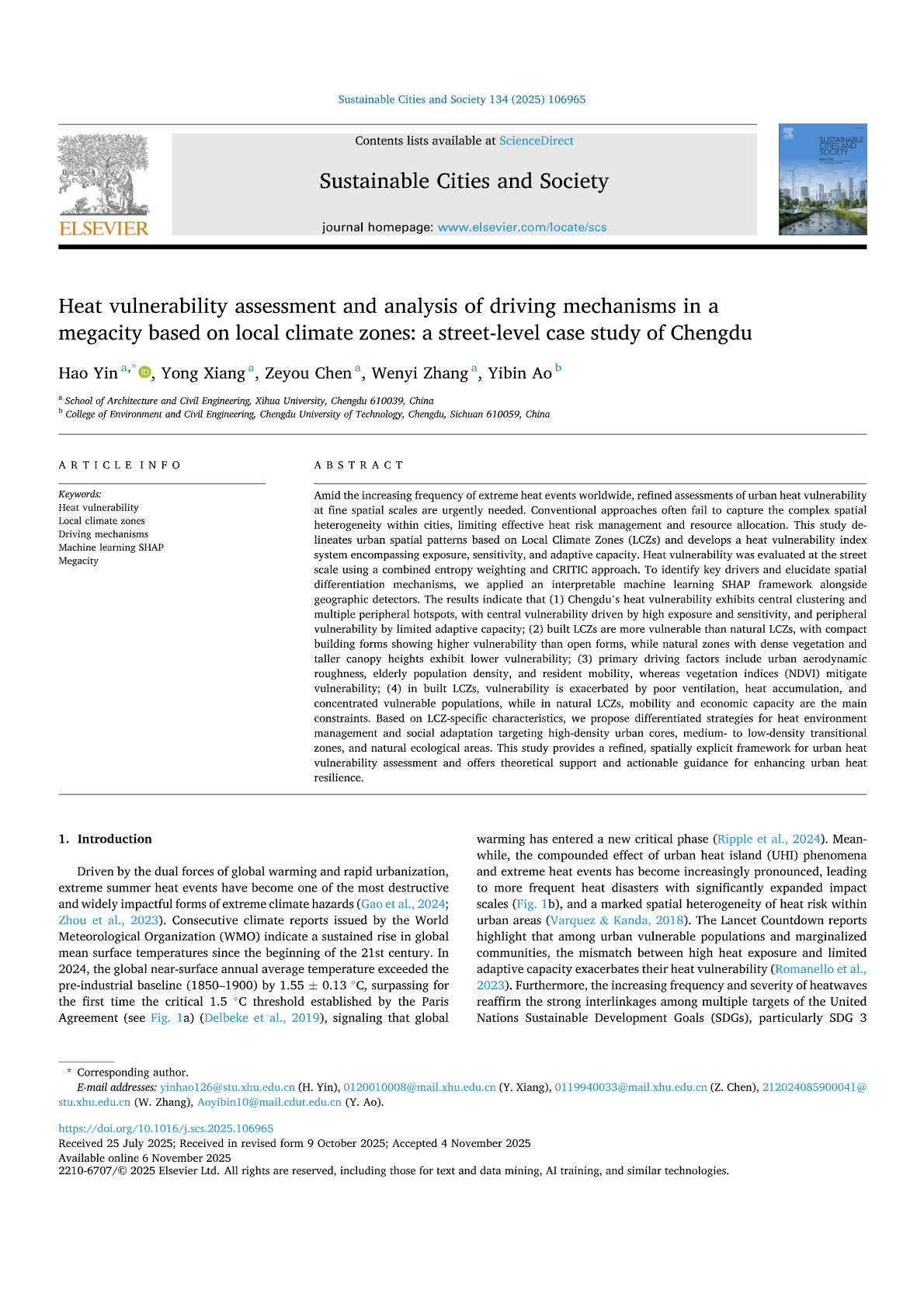 建筑与土木工程学院项勇教授团队在国际知名TOP期刊《Sustainable Cities and Society》(一区TOPIF:12.0)发表了题为“Heat vulnerability assessment and analysis of driving mechanisms in a megacity based on local climate zones: a street- level case study of Chengdu”的研究论文。建筑与土木工程学院2023级硕士研究生殷豪为论文的第一作者,项勇教授为论文的第二作者兼通讯作者,陈泽友副教授为第三作者,均为该研究工作提供了全程指导。