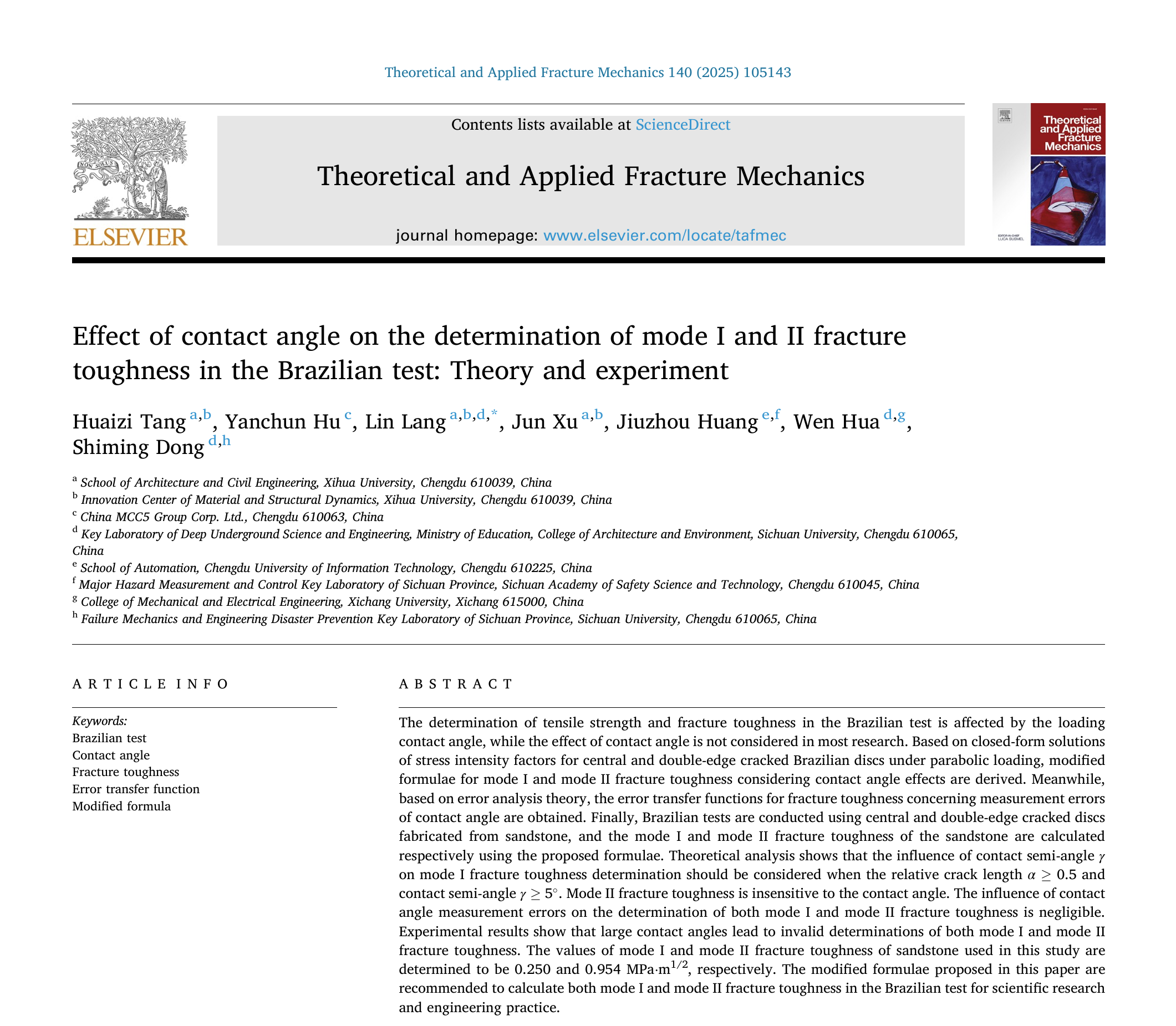近日,西华大学建筑与土木工程学院材料与结构动力学创新研究团队在国际知名期刊《Theoretical and Applied Fracture Mechanics》(JCR一区、中科院二区TOP,IF = 5.6)和《Archive of Applied Mechanics》(JCR二区、中科院三区,IF = 2.5)上分别发表了题为“Effect of contact angle on the determination of mode I and II fracture toughness in the Brazilian test: Theory and experiment”和“Effect of contact angle on the determination of tensile strength in the Brazilian test”的系列研究成果。西华大学为论文第一单位,建筑与土木工程学院郎林副教授为通讯作者,团队汤淮子博士为第一作者、徐军博士为参与作者。