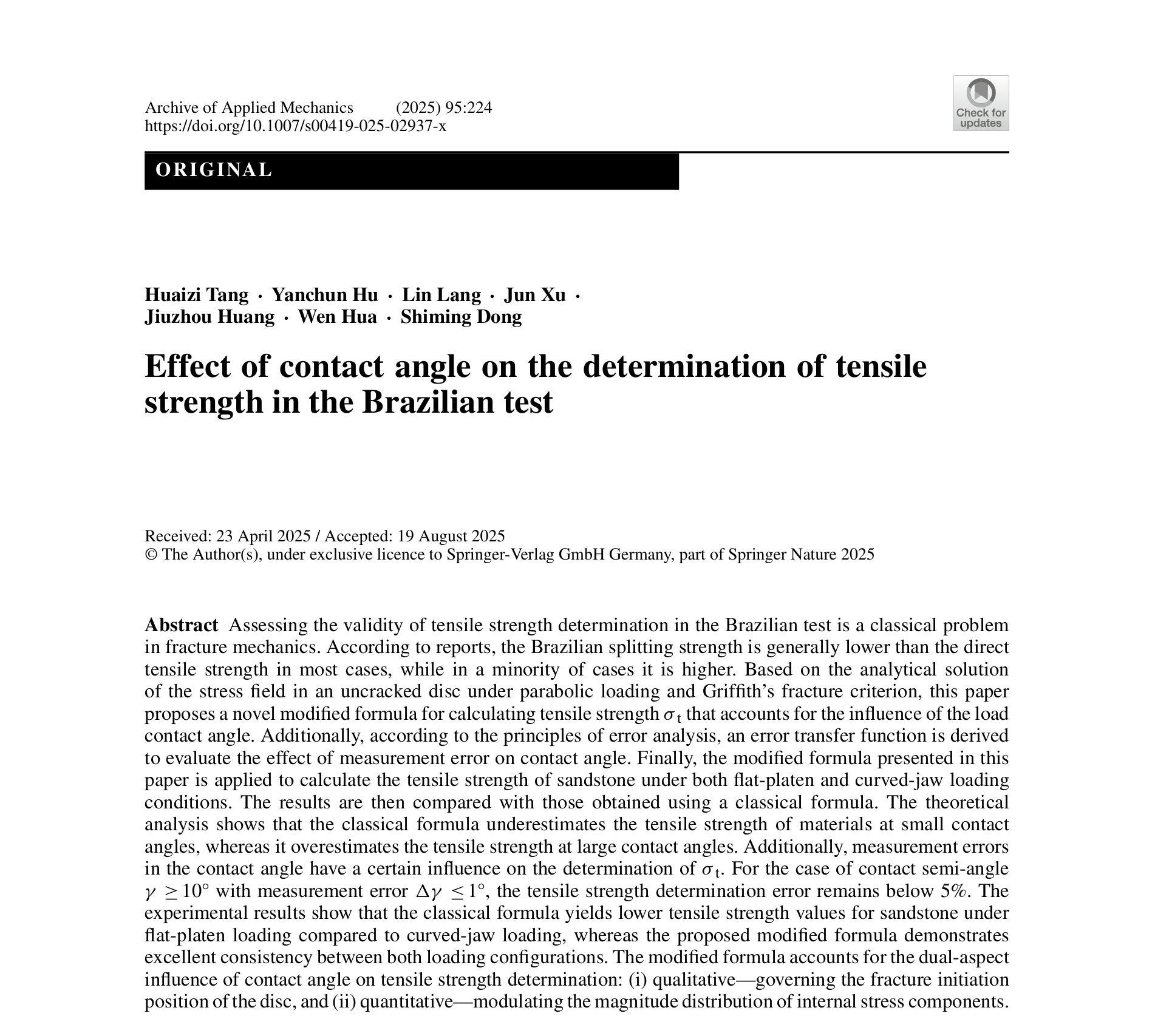近日,西华大学建筑与土木工程学院材料与结构动力学创新研究团队在国际知名期刊《Theoretical and Applied Fracture Mechanics》(JCR一区、中科院二区TOPIF = 5.6)和《Archive of Applied Mechanics》(JCR二区、中科院三区,IF = 2.5)上分别发表了题为“Effect of contact angle on the determination of mode I and II fracture toughness in the Brazilian test: Theory and experiment”和“Effect of contact angle on the determination of tensile strength in the Brazilian test”的系列研究成果。西华大学为论文第一单位,建筑与土木工程学院郎林副教授为通讯作者,团队汤淮子博士为第一作者、徐军博士为参与作者。