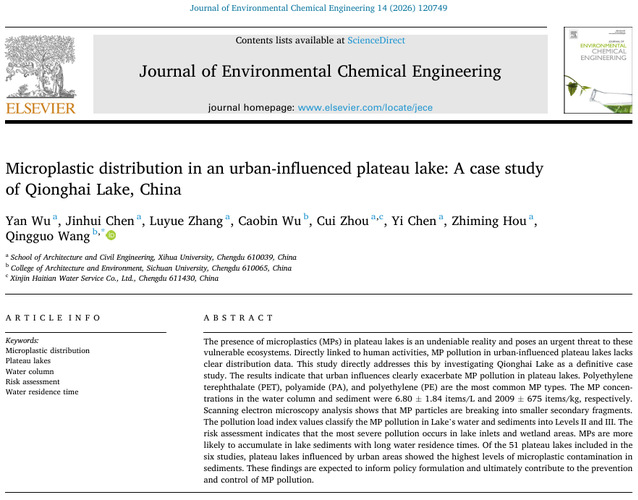 近日,建筑与土木工程学院吴燕副教授课题组在《Journal of Environmental Chemical Engineering》期刊(JCR一区,中科院二区,IF=7.2)发表题为“Microplastic distribution in an urban-influenced plateau lake: A case study of Qionghai Lake, China”的论文。论文以西华大学为第一单位,吴燕副教授为第一作者,2023级土木工程研究生陈瑨辉为第二作者,四川大学王庆国副教授为通讯作者。
