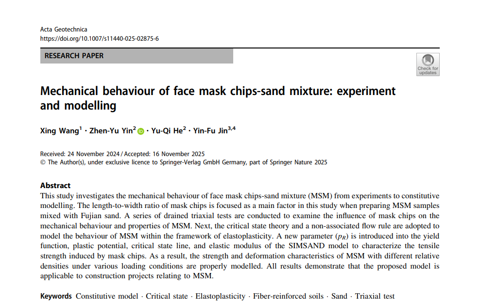 近日,建筑与土木工程学院道路与桥梁工程系教师王星博士作为第一作者在岩土工程领域主流期刊《Acta Geotechnica》发表题为“Mechanical behaviour of face mask chips-sand mixture: experiment and modelling”的研究论文。香港理工大学尹振宇教授为通讯作者,香港理工大学何玉琪博士、深圳大学金银富教授为论文参与作者;西华大学为第一单位。