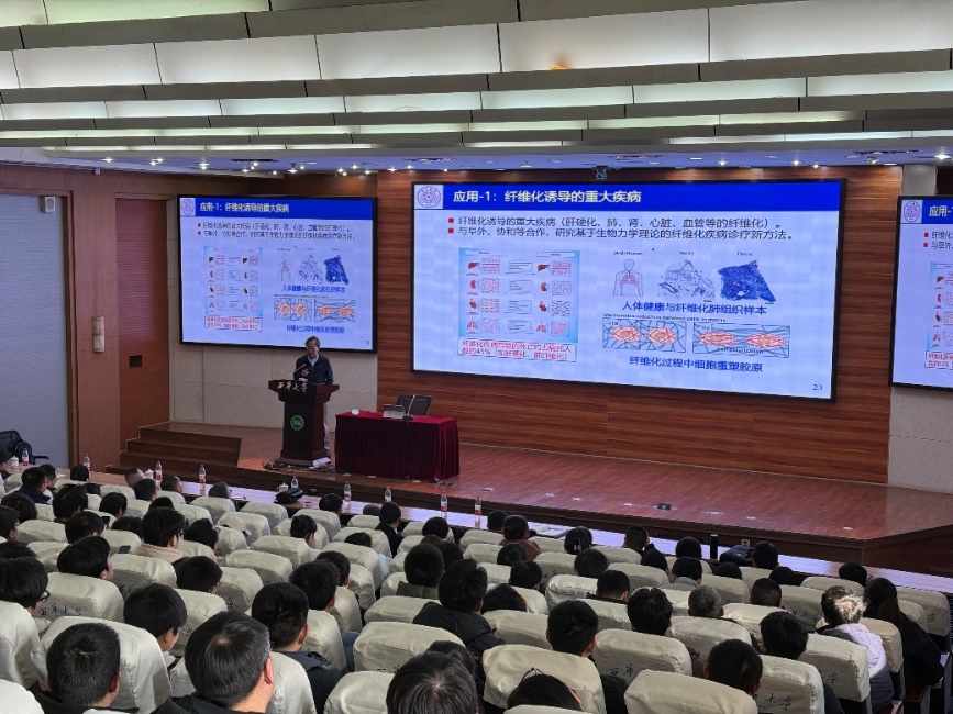 在报告中,冯西桥教授指出,胚胎发育以及癌症、心脑血管、神经和免疫等系统性疾病的发生与演化,本质上源于力学、生物学与化学等多种因素在不同尺度上的耦合互动与协同作用。生物力学的重要任务,正是在生物分子、细胞、组织直至器官等多层级结构中,揭示生命活动背后的力学规律,并为疾病的诊断、干预与治疗提供坚实的理论基础。随后,围绕胚胎发育和肿瘤免疫等重大科学与医学需求,冯西桥教授系统介绍了力–化–生耦合理论的基本框架及其相应的实验与计算方法,从多个层面阐述了生物组织与细胞力–化–生耦合行为的理论进展与应用实践,重点涵盖力–化–生耦合的生长发育理论、生物稳定性理论、多尺度生物力学理论、计算方法与实验、以及细胞群体动力学等,并分享了团队将该理论应用于肿瘤、淋巴、神经系统等生理和病理过程研究的主要成果。