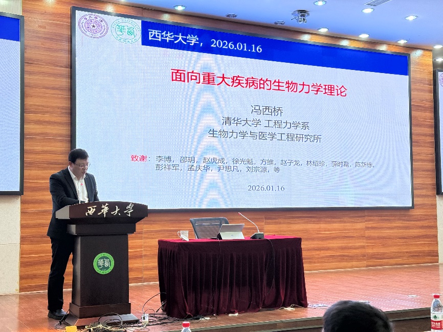 1月16日,建筑与土木工程学院邀请中国科学院院士、中国力学学会副理事长、国家自然科学基金创新群体项目负责人、清华大学冯西桥教授来我校进行学术交流,并作题为《力-化-生耦合的生物力学理论》的学术报告。副校长邵永波主持报告会,来自成都理工大学、西南石油大学和西南科技大学的多位老师,以及建筑与土木工程学院、航空航天与智能装备学院、机械工程学院等多个学院的相关专业师生共同参与。