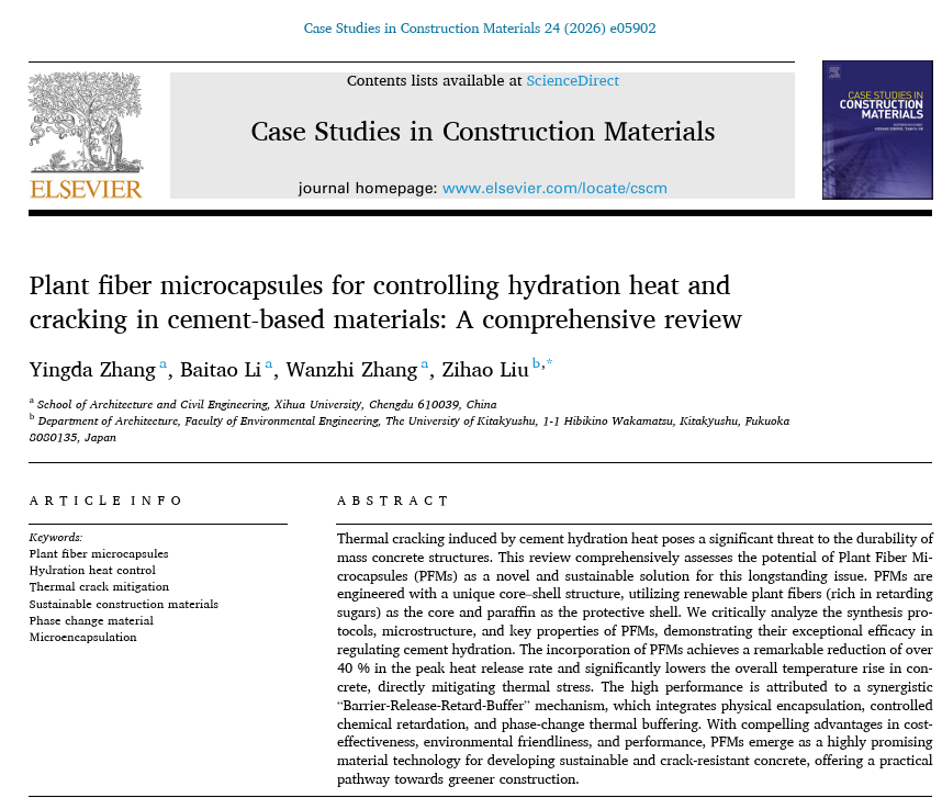 近日,西华大学建筑与土木工程学院绿色高性能材料与结构团队在国际著名期刊《Case Studies in Construction Materials》(JCR一区、中科院二区,IF=6.6)发表了题为“Plant fiber microcapsules for controlling hydration heat and cracking in cement-based materials: A comprehensive review”的综述研究成果。西华大学为论文第一单位,建筑与土木工程学院张英达副教授为论文的第一作者,2025级土木水利研究生李柏涛为第二作者,西华大学张万志讲师为第三作者,北九州市立大学刘子浩特聘讲师为通讯作者。