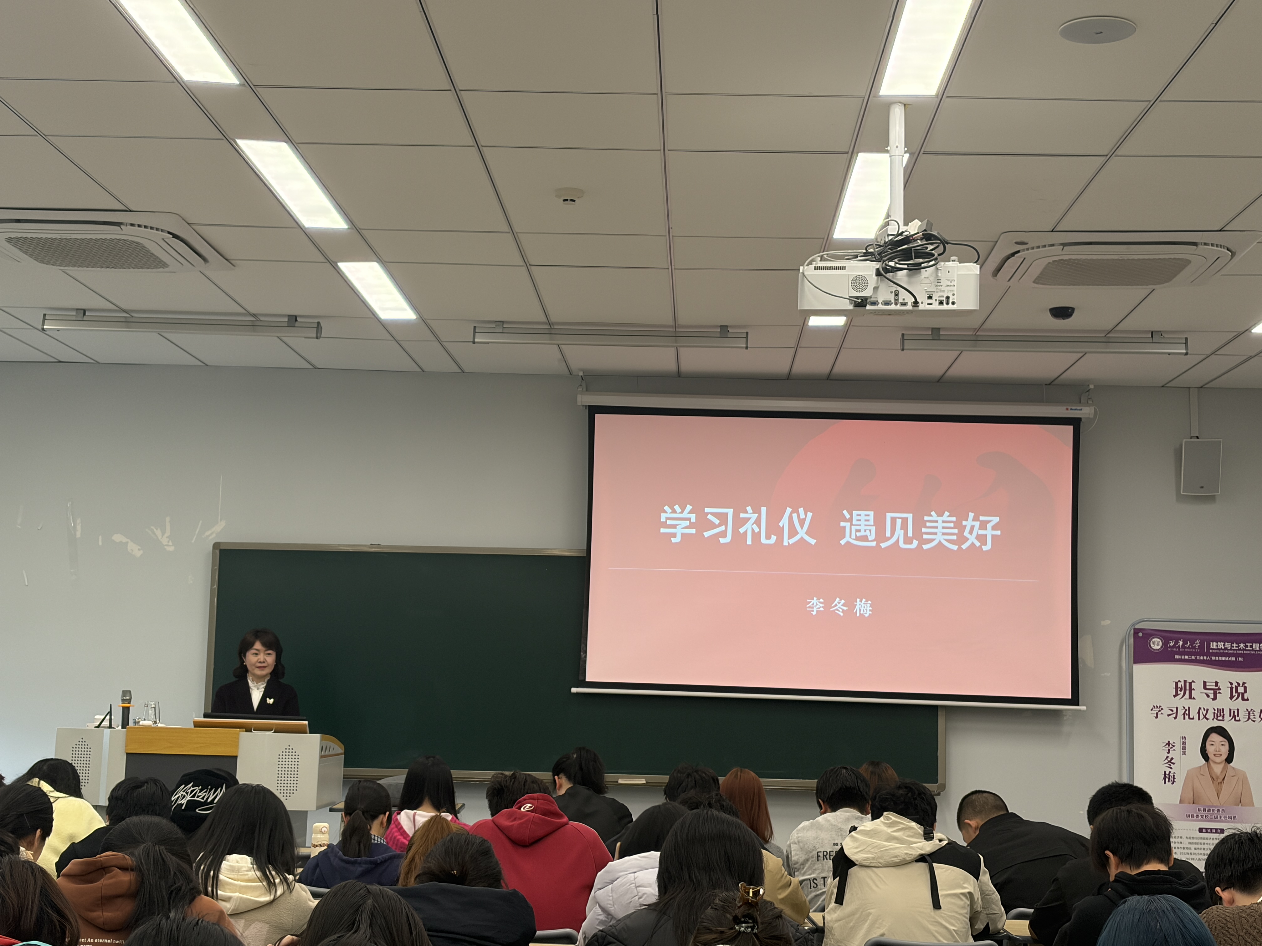 2026年3月6日,建筑与土木工程学院在宜宾校区2A415教室举办了“学习礼仪,遇见美好”主题讲座。本次讲座特邀嘉宾珙县政协委员、珙县县委党校二级主任科员李冬梅主讲,工程管理专业2025级学生参加了讲座。
