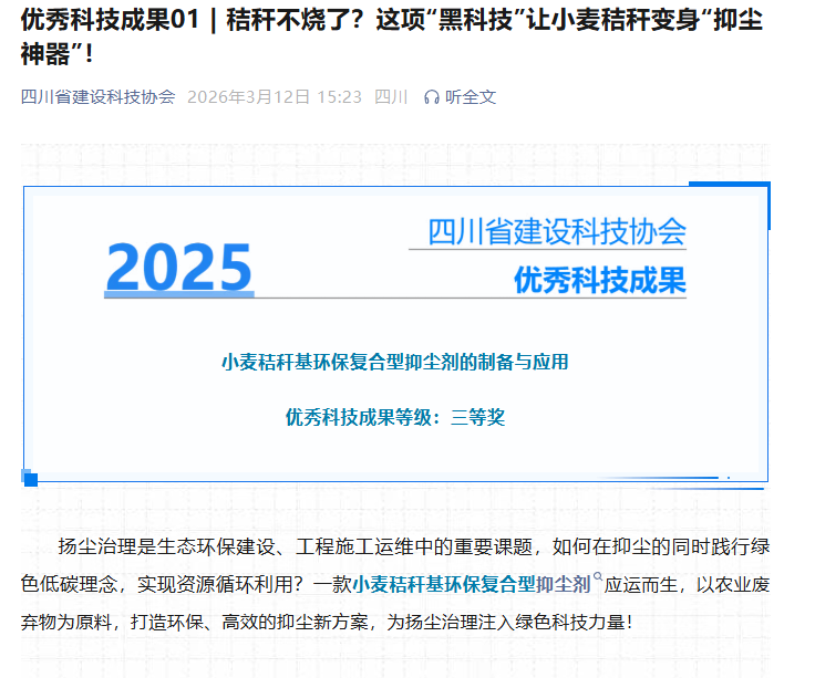 2026年03月12日,建筑与土木工程学院绿色高性能材料与结构团队研究成果《秸秆不烧了?这项“黑科技”让小麦秸秆变身“抑尘神器”!》在四川省建设科技协会官方公众号刊登,该文章的主要内容为西华大学建筑与土木工程学院绿色高性能材料与结构团队的最新研究成果——小麦秸秆基环保复合型抑尘剂。