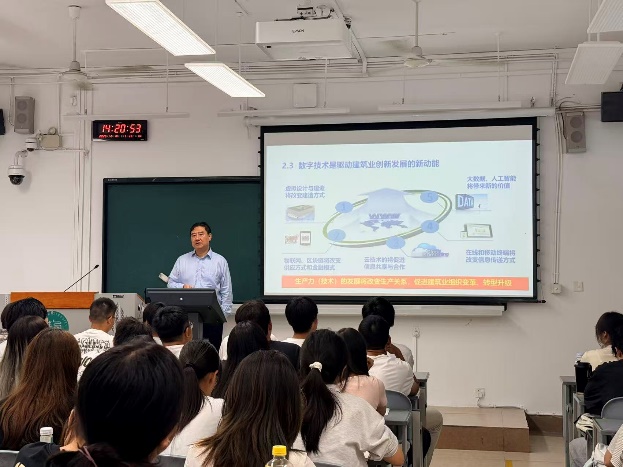 本次授课以《数字化和新工科背景下工程造价专业发展的新思考》为主题,吴教授从“认知数字化变革的大趋势”“把握建筑业发展的大方向”“面向未来培养工程管理人才”三大维度,为新生们描绘了行业发展的全景图景。