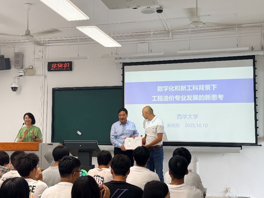 2025年10月10日14:00,西华大学建筑与土木工程学院迎来了一场高规格的专业导论课。教育部工程管理和工程造价专业指导委员会委员、住建部工程管理专业评估委员会副主任、北京市建设工程招标投标和造价管理协会会长吴佐民受邀为工程造价专业2025级全体新生讲授《工程造价专业导论》第一课。