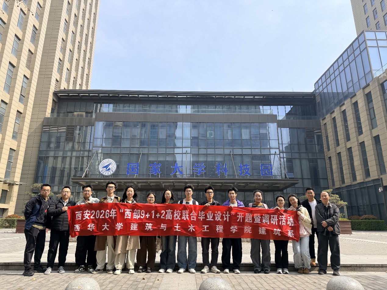 2026年3月12日,西华大学建筑与土木工程学院建筑系曹毅主任、许康、何昕、瓮少彬老师带领周明章等11名学生参加“西部9+1+2高校联合毕业设计”开题暨调研活动,活动在西北工业大学友谊校区学术交流中心成功举办。本次活动由西部九校建筑类教学联盟主办、《规划师》杂志社协办、西北工业大学承办,聚焦国家城市更新战略的现实发展需求,搭建跨校交流、资源共享与协同育人的创新实践平台。