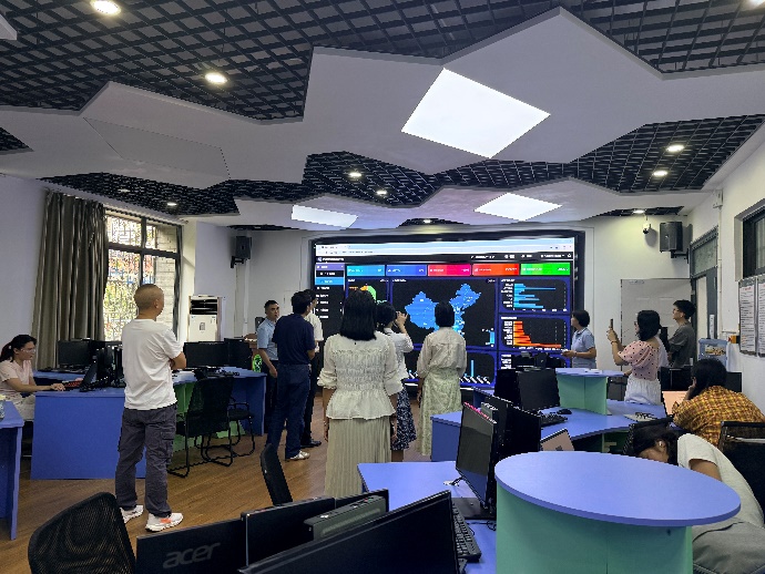 调研伊始,来宾参观了建设投资与数智造价研究中心,由工程造价系主任肖光朋全程讲解。肖老师重点展示了“西华大学指标云中心”的驾驶舱可视化、数据查询、对比分析等核心功能,引发来宾浓厚兴趣。双方就数据标准、教学应用场景与系统集成等问题进行了深入交流。
